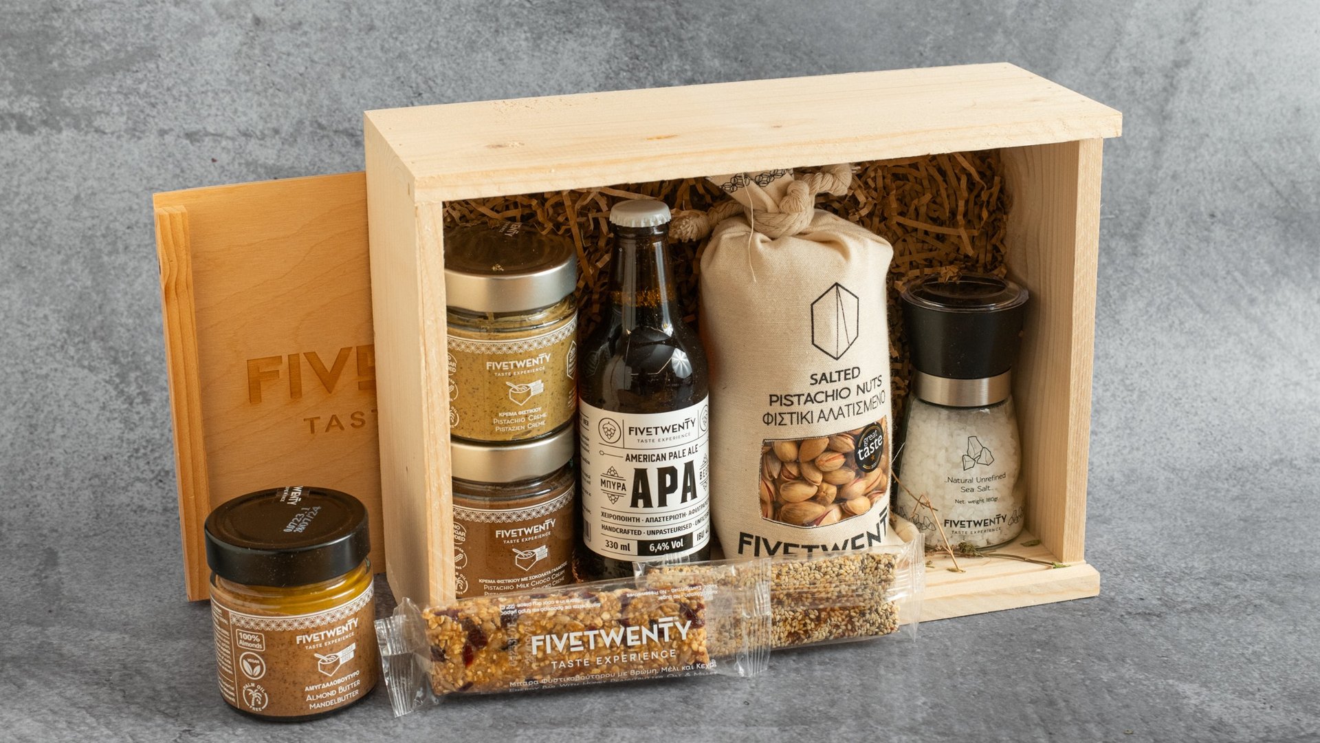 Όλα συσκευασμένα σε χειροποίητο ξύλινο κουτί ελληνικής κατασκευής.